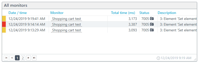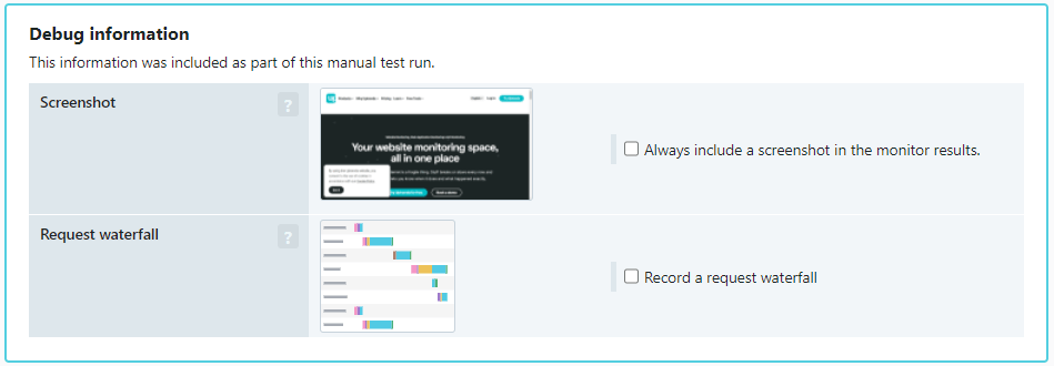 Les captures d’écran et les graphiques en cascade sont indispensables pour le dépannage et le débogage des erreurs de transaction. Elles sont générées automatiquement quand vous cliquez sur le bouton Tester maintenant. Par ailleurs, les abonnés Enterprise et Business obtiennent une capture d’écran pour la première erreur confirmée.